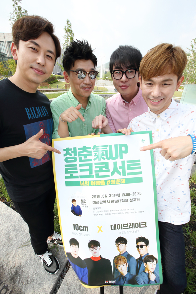 콘서트 당일 현장에서도 KT뮤직에서 마련한 룰렛 이벤트, 청춘들의 응원 메시지를 담고 공유할 수 있는 캘리그라피 엽서 작성, 청춘들이 공감하는 센스있는 멘트가 적혀있는 미니포토 사진 촬영 등이 있다.사진은 이번 콘서트를 함께 할 홍대 대표 훈남밴드 ‘데이브레이크’가 포즈를 취하고 있다.<사진제공=KT>