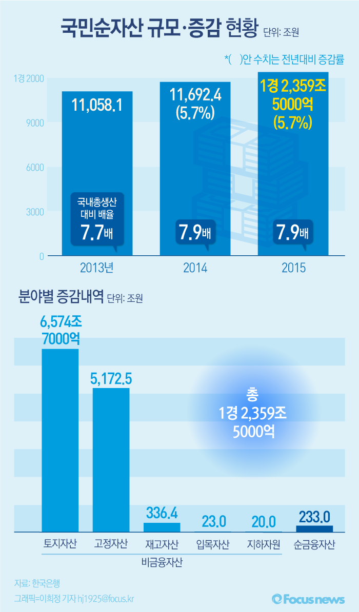 (서울=포커스뉴스) 14일 한국은행과 통계청이 공동 발표한 '2015년 국민대차대조표(잠정)'을 살펴보면 2015년 국민순자산은 1경2359조5000억원으로 전년대비 5.7% 증가했다. 2015년 GDP대비 국민순자산은 7.9배로 집계돼 2014년과 동일한 배율을 유지했다.