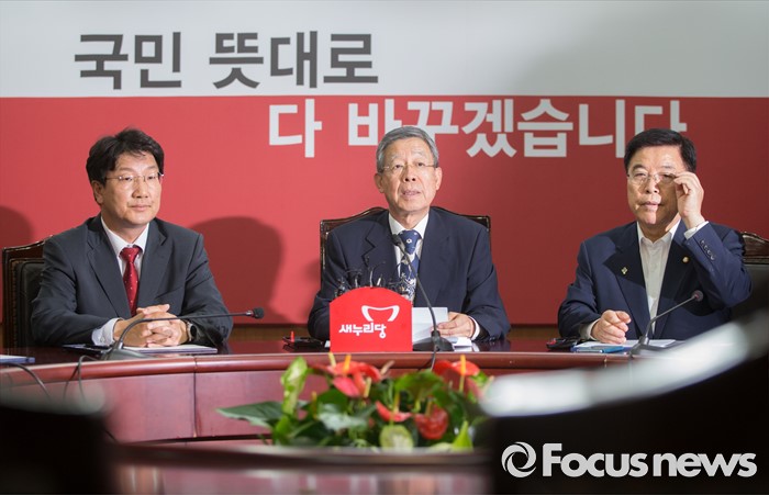 (서울=포커스뉴스) 김희옥(가운데) 새누리당 혁신비상대책위원장이 14일 오후 서울 여의도 국회에서 열린 혁신비상대책위원 회의에서 모두발언을 하고 있다. 왼쪽부터 권성동 사무총장, 김 위원장, 김광림 정책위의장.