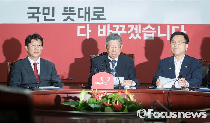 (서울=포커스뉴스) 김희옥(가운데) 새누리당 혁신비상대책위원장이 14일 오후 서울 여의도 국회에서 열린 혁신비상대책위원 회의에서 모두발언을 하고 있다. 왼쪽부터 권성동 사무총장, 김 위원장, 김광림 정책위의장.