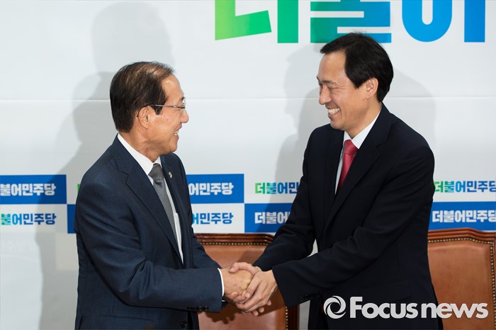 (서울=포커스뉴스) 우상호(오른쪽) 더불어민주당 원내대표가 14일 오후 서울 여의도 국회에서 이원종 대통령비서실장과 면담에 앞서 악수 하고 있다.