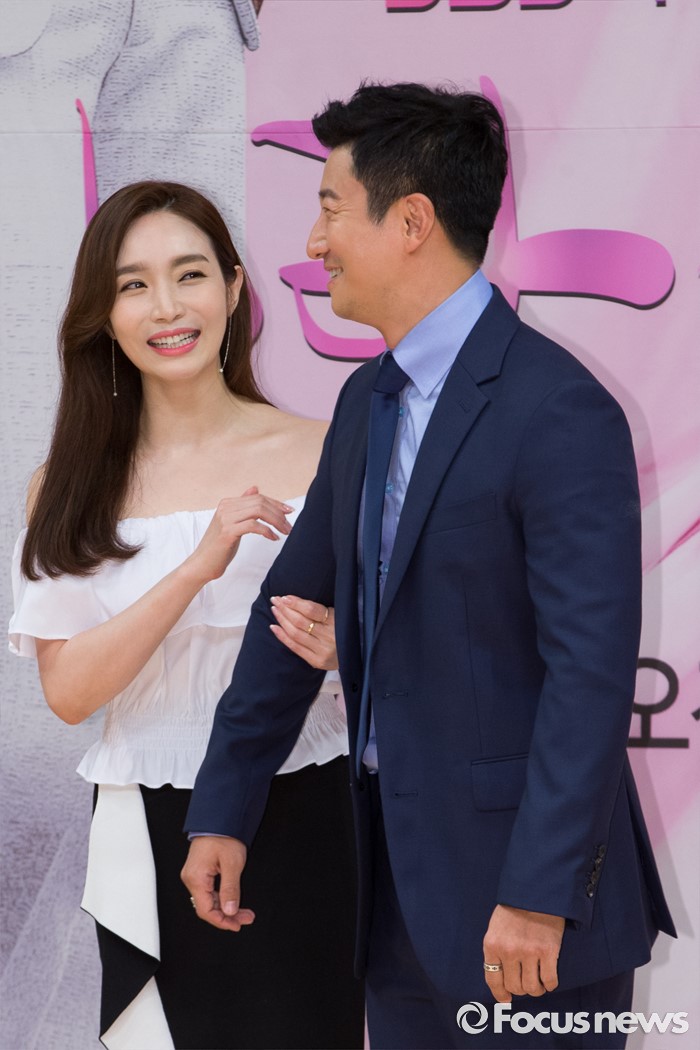 (서울=포커스뉴스) 14일 오후 서울 양천구 SBS 목동사옥에서 열린 SBS 일일드라마 '사랑이 오네요' 제작발표회에 참석한 배우 이훈(왼쪽)과 이민영이 포토타임을 갖고 있다.