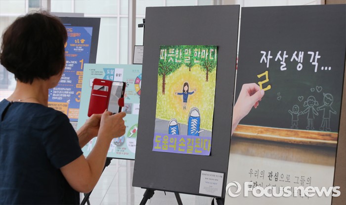 (세종=포커스뉴스) 14일 오후 세종시 정부세종청사 15동 대강당에서 열린 생명존중 교육자료 및 수기공모전 시상식에서 참가자가 수상작품을 바라보고 있다.