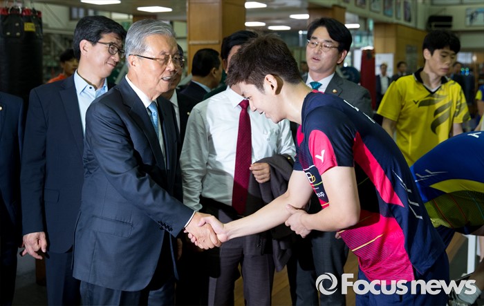 (서울=포커스뉴스) 리우데자네이루 하계올림픽을 52일여 앞둔 14일 오후 서울 노원구 태릉선수촌을 방문한 김종인(왼쪽) 더불어민주당 비상대책위원회 대표가 배드민턴 국가대표 이용대를 격려하고 있다.