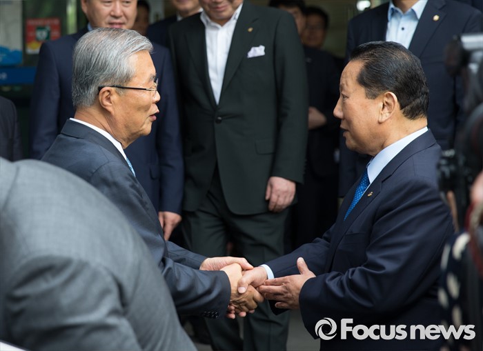 (서울=포커스뉴스) 리우데자네이루 하계올림픽을 52일여 앞둔 14일 오후 서울 노원구 태릉선수촌을 방문한 김종인(오른쪽) 더불어민주당 비상대책위원회 대표가 김정행 대한체육회 공동회장과 인사를 나누고 있다.