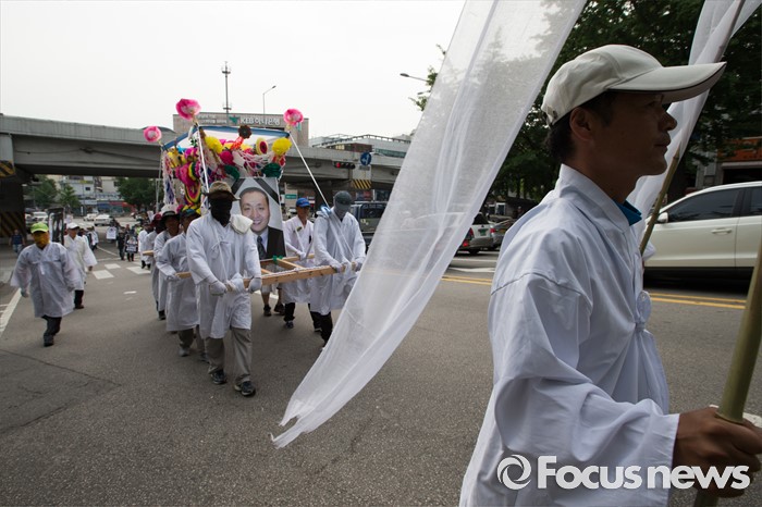 (서울=포커스뉴스) 14일 오후 유성기업 노동자 故 한광호씨의 분향소를 양재동 현대차 본사 앞으로 옮기는 꽃길 100리 행진 2일째에 참여한 노동자들이 국회를 출발해 한남동 현대차 정몽구 회장 집으로 행진하고 있다.