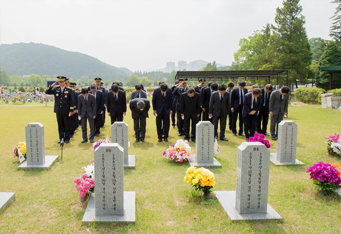 (대전=포커스뉴스) 국민안전처 직원들이 호국보훈의 달을 맞아 14일 대전현충원을 찾아 소방 및 해경 묘역을 찾아 묵념을 하고 있다. <사진제공=국민안전처>