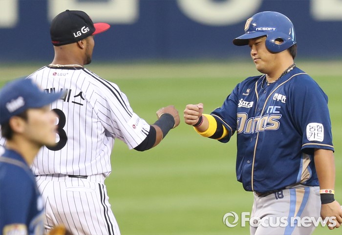 (서울=포커스뉴스) 14일 서울 잠실구장에서 열린 2016 프로야구 NC-LG 경기 2회초 2사후 좌중간 안타로 진루한 NC 박석민이 손시헌의 2루수 플라이 아웃으로 공수교대때 LG 히메네스와 주먹을 마주치고 있다.