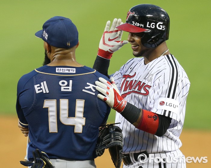 (서울=포커스뉴스) 14일 서울 잠실구장에서 열린 2016 프로야구 NC-LG 경기 3회말 1사 2루에서 LG 히메네스가 1타점 좌익수 왼쪽 안타를 치고 1루에서 NC 테임즈와 밝은 표정으로 대화하고 있다.