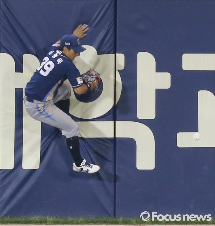 | △ 점프하며 펜스에 부딪히는 NC 이종욱 |