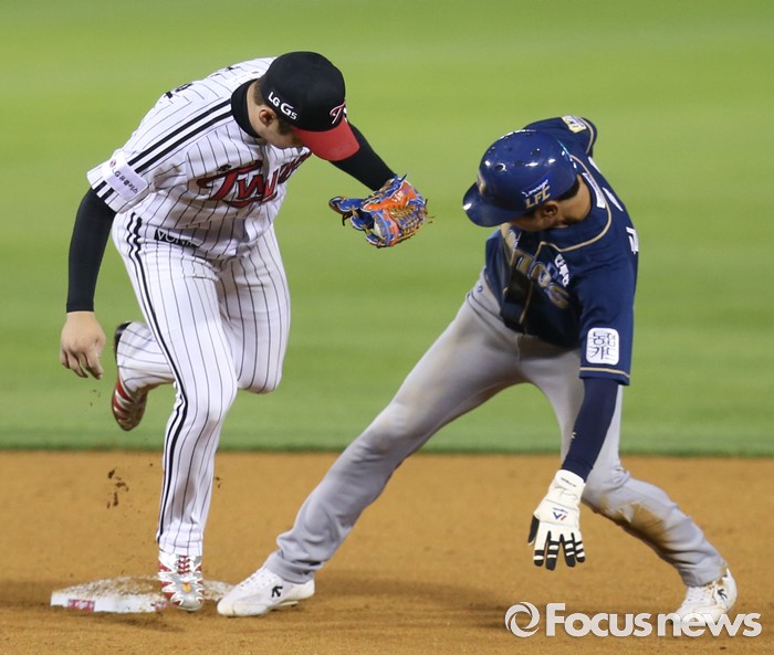 (서울=포커스뉴스) 14일 서울 잠실구장에서 열린 2016 프로야구 NC-LG 경기 7회초 1사 1루에서 NC 1루주자 김종호가 2루 도루를 시도하다 아웃되고 있다. 왼쪽은 LG 유격수 오지환.