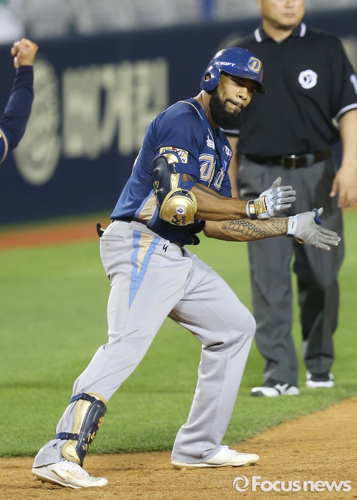 | △ 역전 3루타 치고 환호하는 NC 테임즈 |
