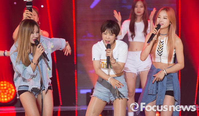 (서울=포커스뉴스) 14일 오후 서울 마포구 SBS프리즘 타워에서 열린 SBS MTV '더쇼' 생방송 현장에 참여한 걸그룹 EXID의 멤버 혜린(가운데)가 앵콜무대를 선보이고 있다.
