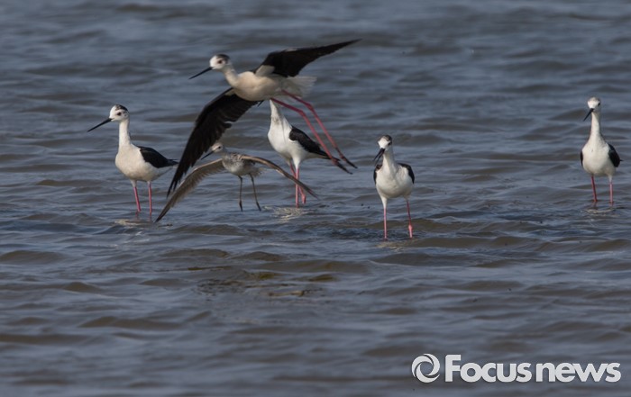 (인천=포커스뉴스) 영종도 갯벌매립지에서 번식중인 장다리물떼새들이둥지 인근에 노랑발도요가 나타나자, 모두 달려가 영역 밖으로 쫒아내고 있다.