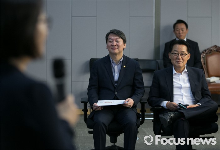 (서울=포커스뉴스) 15일 오전 서울 여의도 국회 의원회관에서 열린 15차 국민의당 정책역량강화 집중 워크숍에 참석한 안철수(가운데) 상임공동대표와 박지원(오른쪽) 원내대표가 이나영 중앙대 사회학과 교수의 강연을 듣고 있다.