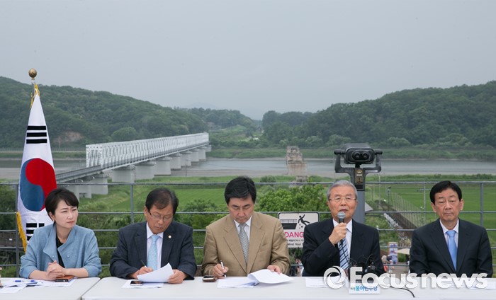 (파주=포커스뉴스) 15일 오전 경기도 파주 임진각 통일전망대에서 열린 더불어민주당 비상대책위원회의에 참석한 김종인(오른쪽 두번째) 비대위 대표가 모두발언을 하고 있다.