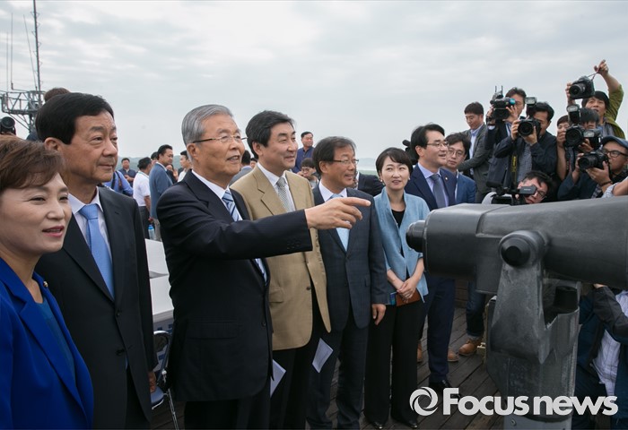 (파주=포커스뉴스) 15일 오전 경기도 파주 임진각 통일전망대에서 더불어민주당 비상대책위원회의를 마친 김종인 비대위 대표와 의원들이 임진각 철교 주변을 바라보고 있다.
