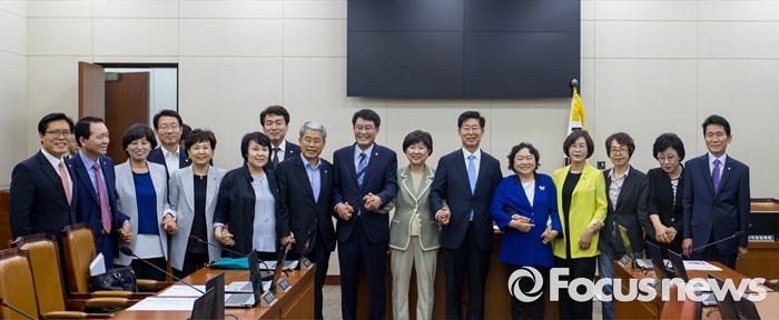 (서울=포커스뉴스) 양승조(오른쪽 여섯 번째) 국회 보건복지위원회 위원장을 비롯한 3당 간사 및 위원들이 15일 오전 서울 여의도 국회에서 열린 '보건복지위원회 전체회의'를 마친 손을 맞잡고 사진촬영을 하고 있다.