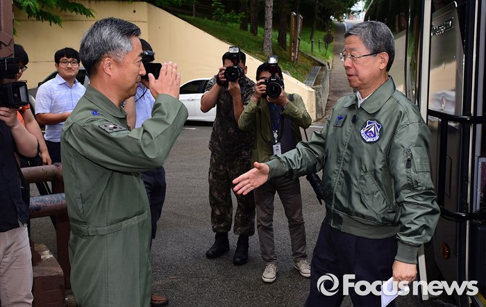 (오산=포커스뉴스) 김희옥(오른쪽) 새누리당 혁신비상대책위원장이 15일 오전 경기도 오산 공군작전사령부를 방문해 이왕근 공군 작전사령관과 인사하고 있다.