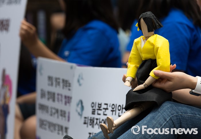(서울=포커스뉴스) 15일 오후 서울 종로구 옛 일본대사관 앞에서 열린 제1235차 일본군 위안부 문제해결을 위한 정기 수요집회 참석한 한 시민이 소녀상 인형을 들고 있다.