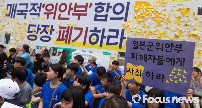 (서울=포커스뉴스) 15일 오후 서울 종로구 옛 일본대사관 앞에서 제1235차 일본군 위안부 문제해결을 위한 정기 수요집회가 열리고 있다.
