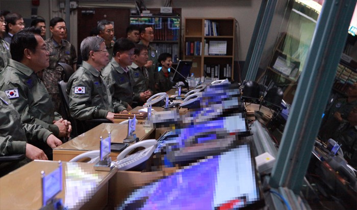 (오산=포커스뉴스) 김희옥 새누리당 혁신비대위원장, 정진석 원내대표 등 의원들이 15일 경기도 오산 공군작전사령부를 방문해 항공우주작전본부 내 지휘소에서 작전현황에 대한 브리핑을 받고 있다. <사진제공=공군>