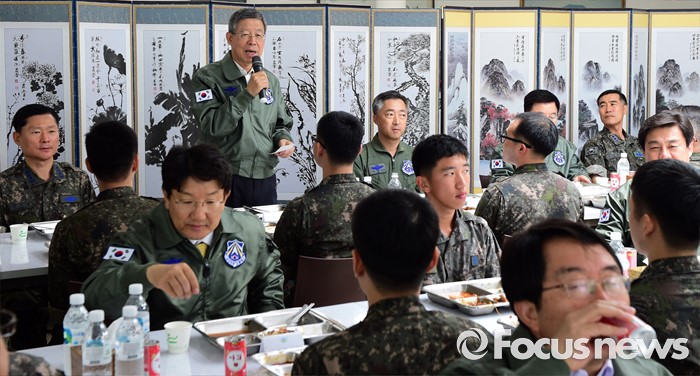 (오산=포커스뉴스) 김희옥 새누리당 혁신비상대책위원장이 15일 오후 경기도 오산 공군작전사령부를 방문해 오찬에 앞서 장병들에게 격려사를 하고 있다.