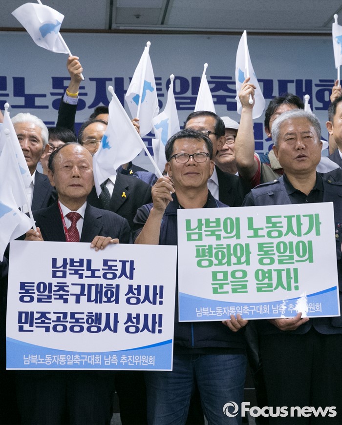 (서울=포커스뉴스) 15일 오후 서울 여의도 국회도서관에서 남북노동자통일축구대회 공동추진위원회 결성식를 마친 김동만(앞줄 오른쪽부터) 한국노총 위원장, 최종진 민주노총 위원장 직무대행, 이창복 615공동선언실천남측위원회 상임대표의장 등 남측 추진위원회 참석자들이 한반도기를 흔들며 취재진을 향해 포즈를 취하고 있다.