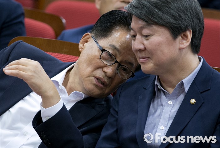 (서울=포커스뉴스) 15일 오후 서울 여의도 국회 의원회관에서 열린 '소비자 집단소송과 징벌적 손해배상제도 쟁점과 방향' 토론회에 참석한 안철수(오른쪽) 국민의당 상임공동대표와 박지원 원내대표가 대화하고 있다.