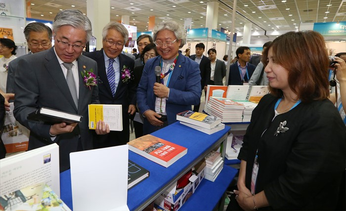 (서울=포커스뉴스) 김종덕 문화체육관광부 장관이 15일 서울 강남구 코엑스에서 열린 ‘제22회 서울국제도서전 및 제3회 디지털북페어코리아 개막식‘을 마치고 내빈들과 함께 관계자의 안내로 전시장을 둘러보고 있다. <사진제공=문화체육관광부>