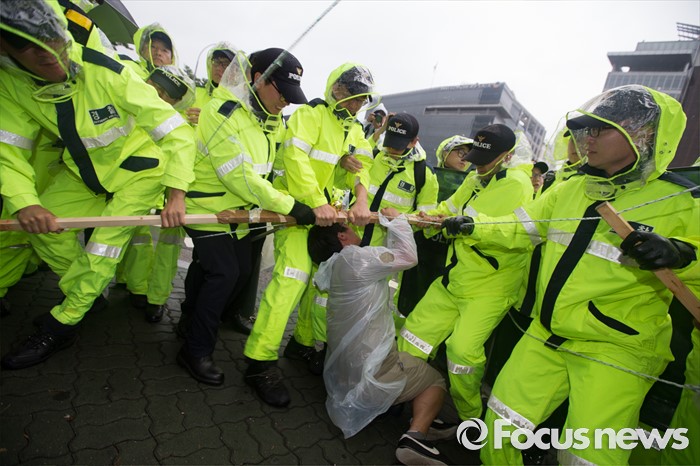 (서울=포커스뉴스) 15일 오후 유성기업 노동자 故 한광호씨의 분향소를 양재동 현대차 본사 앞으로 옮기는 꽃길 100리 행진에 참여한 노동자들이 현대차 본사 앞에서 분향소 설치로 인한 문제로 실랑이를 벌이고 있다.