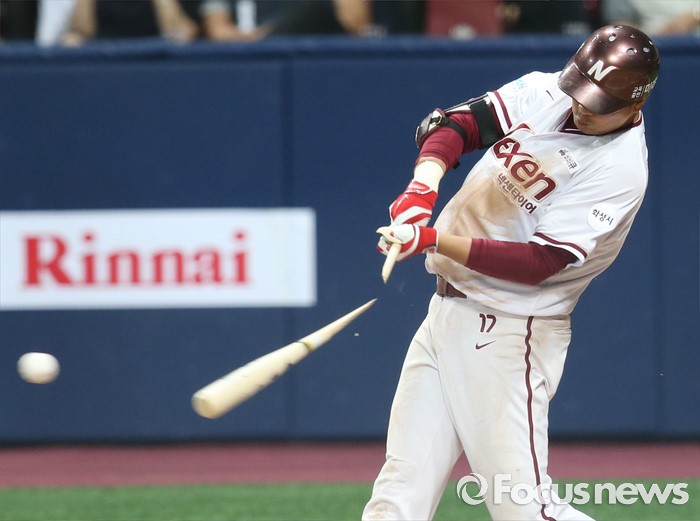 (서울=포커스뉴스) 15일 서울 고척 스카이돔 구장에서 열린 2016 프로야구 롯데-넥센 경기 2회말 2사 1루에서 넥센 채태인의 타격 도중 배트가 부러지며 공과 함께 날아가고 있다.