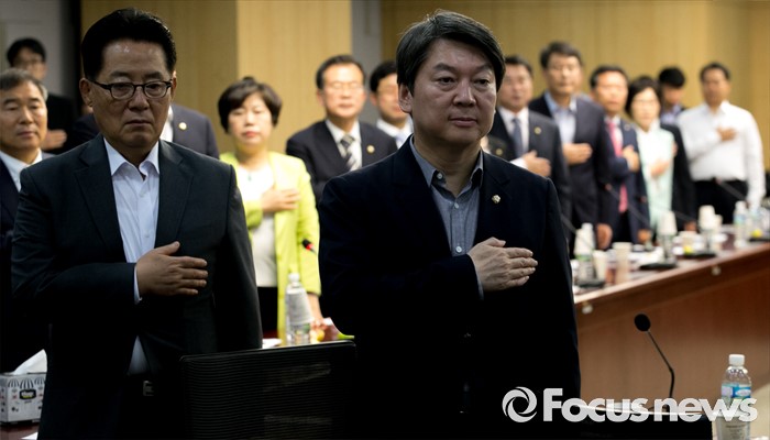 (서울=포커스뉴스) 16일 오전 서울 여의도 국회 의원회관에서 열린 국민의당 16차 정책역량강화 워크숍에 참석한 안철수 상임공동대표, 박지원 원내대표 등 의원들이 국기에 대한 경례를 하고 있다.