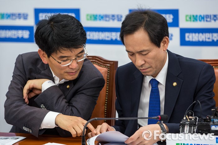 (서울=포커스뉴스) 우상호(오른쪽) 더불어민주당 원내대표와 박완주 원내수석부대표가 16일 오전 서울 여의도 국회에서 열린 정책조정회의에 참석해 대화를 나누고 있다.