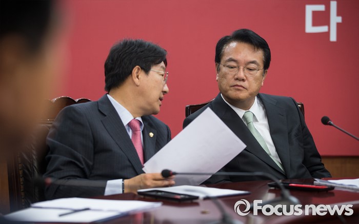 (서울=포커스뉴스) 정진석(오른쪽) 새누리당 원내대표와 권성동 사무총장이 16일 오전 서울 여의도 국회에서 열린 혁신비상대책위원 회의에서 대화하고 있다. 이 회의에서 새누리당 혁신위는 무소속 복당 문제를 논의 한다.
