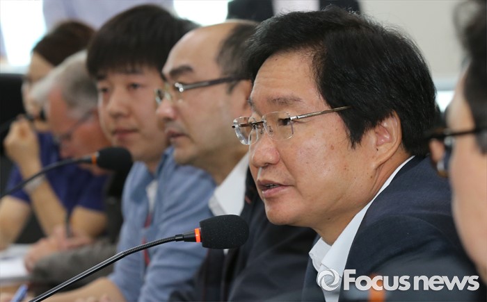 (세종=포커스뉴스) 김영석(오른쪽) 해양수산부 장관이 16일 오전 세종시 정부세종청사 해수부 중회의실에서 열린 세월호 공정 점검회의에 참석해 모두발언을 하고 있다.