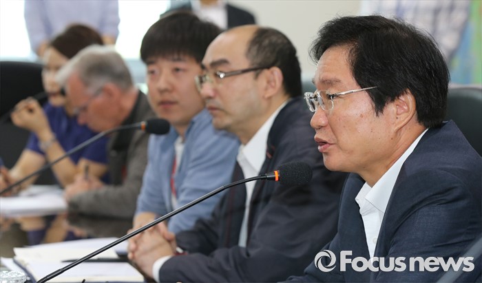 (세종=포커스뉴스) 김영석(오른쪽) 해양수산부 장관이 16일 오전 세종시 정부세종청사 해수부 중회의실에서 열린 세월호 공정 점검회의에 참석해 모두발언을 하고 있다.