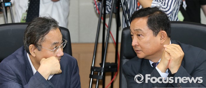 (세종=포커스뉴스) 김영석 해양수산부 장관 주재로 16일 오전 세종시 정부세종청사 해수부 중회의실에서 열린 세월호 공정 점검회의에서 참석자들이 회의에 앞서 논의를 하고 있다.