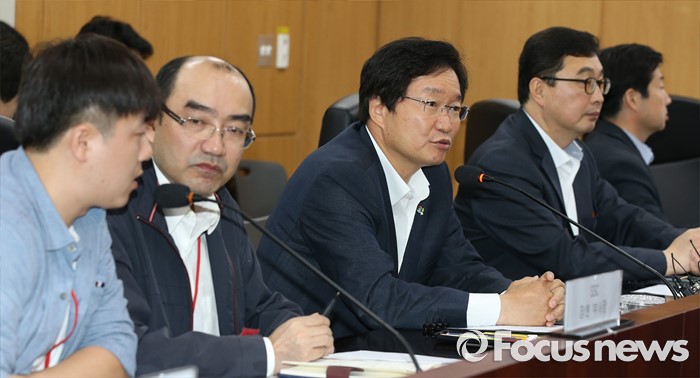 (세종=포커스뉴스) 김영석(왼쪽 세 번째) 해양수산부 장관이 16일 오전 세종시 정부세종청사 해수부 중회의실에서 열린 세월호 공정 점검회의에 참석해 모두발언을 하고 있다.