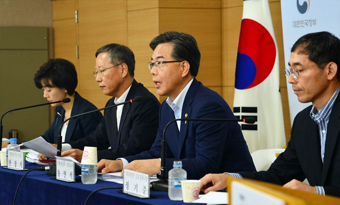 (서울=포커스뉴스) 송언석 기획재정부 차관이 6월 16일 정부서울청사에서 열린 '2015년도 공공기관 경영평가결과 및 후속 조치'와 관련하여 브리핑을 하고 있다. 왼쪽부터 박순애 경영평가 부단장, 반장식 경영평가 단장, 송언석 차관, 정기준 기재부 공공정책국장. <사진제공=기획재정부>