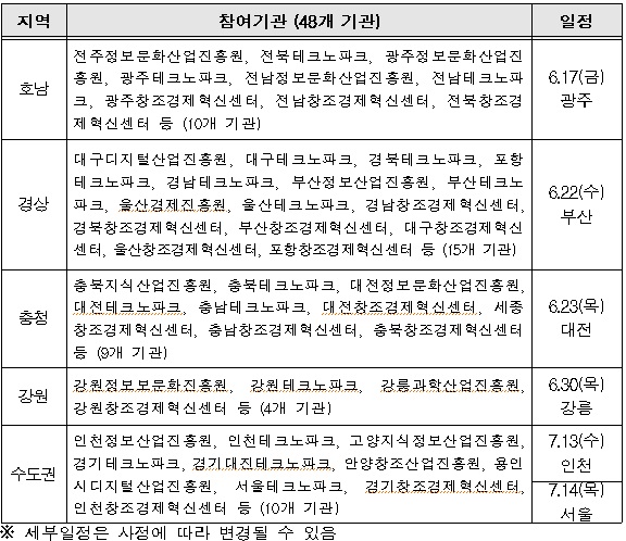 장석영 미래부 인터넷융합정책관은 “이번 지역 단위 규제발굴회의는 규제수요를 수도권을 넘어 지역까지 확대하여 발굴한다는데 의미가 있다”면서 “미래부는 앞으로도 각종 진흥기관, 기업, 협·단체 등과 소통하면서 규제개혁을 끈기 있게 추진해나가겠다“고 밝혔다.지역별 규제발굴회의 추진일정.<표제공=미래부>