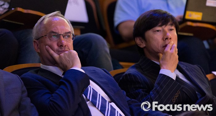(서울=포커스뉴스) 16일 오후 서울 종로구 올레스퀘어에서 열린 FIFA U-20 월드컵 엠블럼·슬로건 발표 행사에서 울리 슈틸리케(왼쪽) 감독과 신태용 감독이 정몽규 FIFA U-20 월드컵 조직위원장의 환영사를 경청하고 있다.
