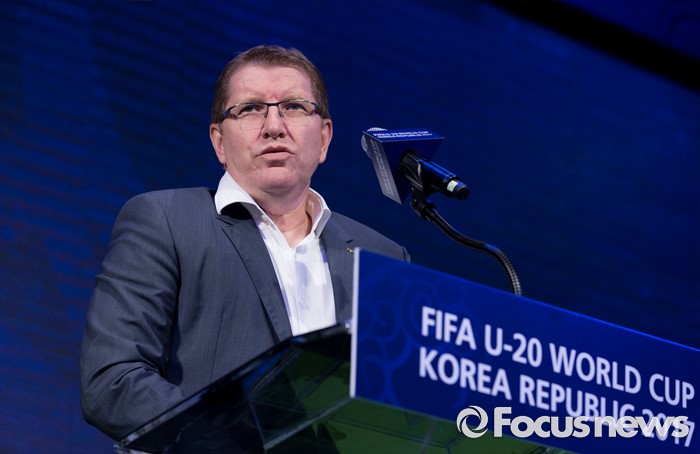 (서울=포커스뉴스) 16일 오후 서울 종로구 올레스퀘어에서 열린 FIFA U-20 월드컵 엠블럼·슬로건 발표 행사에서 티에리 바일 FIFA 마케팅 디렉터가 인사말을 하고 있다.