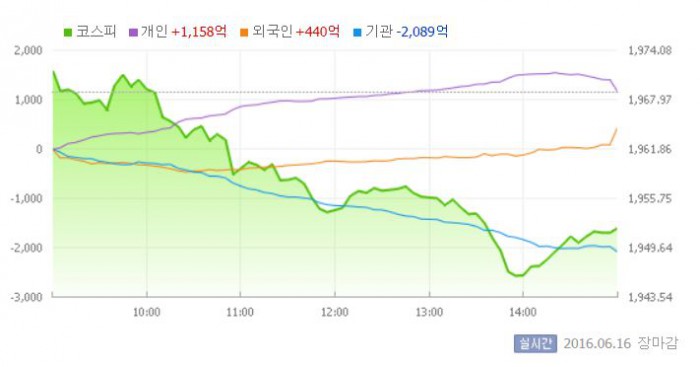 16일 코스피지수는 전일 대비 0.86%(16.84포인트) 하락한 1951.99에 장을 마쳤다. 코스닥지수는 전날 보다 2.07%(14.41포인트) 내린 680.25에 마감했다.