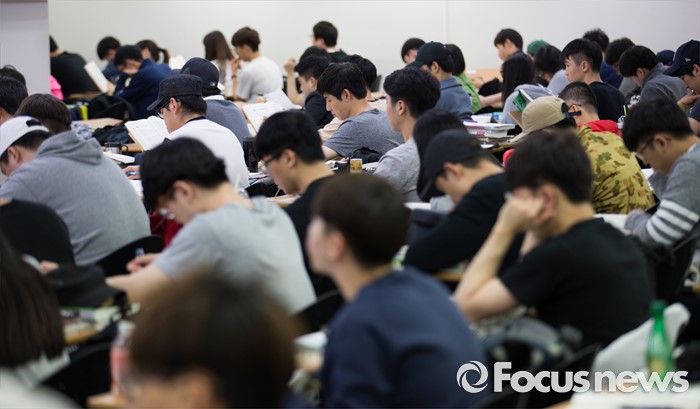 (서울=포커스뉴스) 지방직 9급 공무원 필기시험을 이틀 앞둔 15일 오후 서울 동작구 공단기 노량진학원에서 시험 응시자들이 강의을 듣고 있다.