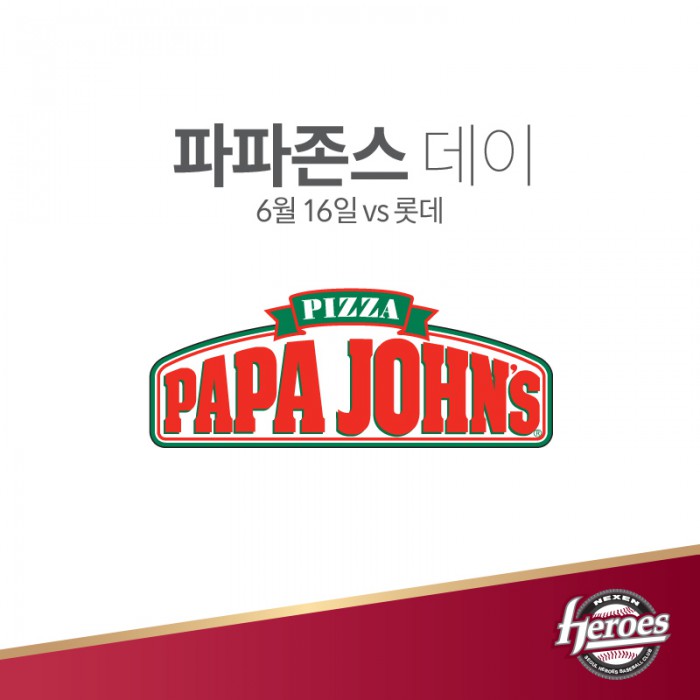 한편, 구로구민에게 내야지정석 3층과 4층, 외야지정석을 50% 할인해 준다. 주소지가 구로구로 표기된 증명서를 보여줘야 한다.프로야구 넥센이 16일 고척돔에서 열리는 롯데와의 경기에 '파파존스 데이' 행사를 연다. 사진은 '파파존스 데이' 행사 이미지. <사진제공=넥센 히어로즈>