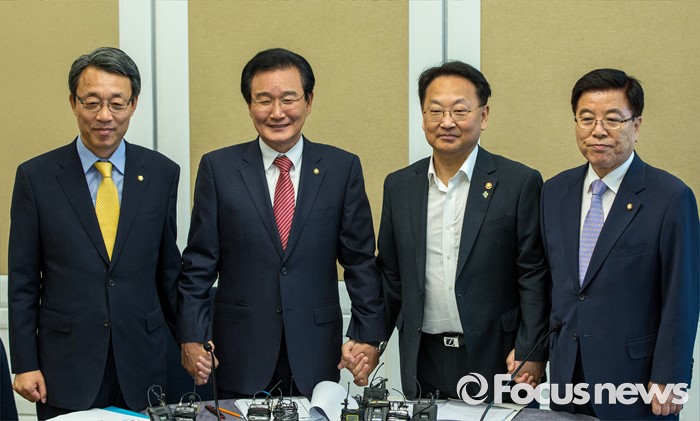 (서울=포커스뉴스) 16일 오후 서울 여의도 국회에서 열린 '2차 민생경제 현안점검회의'에 참석한 3당 정책위의장과 경제부총리가 회의 시작에 앞서 사진촬영 하고 있다. 왼쪽부터 김성식 국민의당 정책위의장, 변재일 더불어민주당 정책위의장, 유일호 경제부총리 겸 기획재정부 장관, 김광림 새누리당 정책위의장.