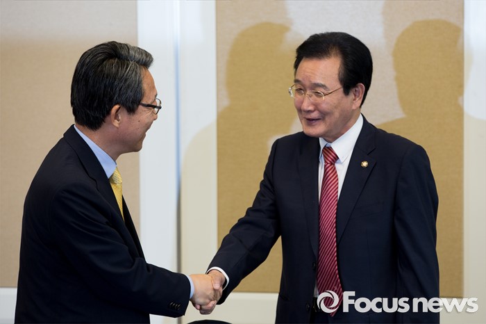 (서울=포커스뉴스) 변재일(오른쪽) 더불어민주당 정책위의장과 김성식 국민의당 정책위의장이 16일 오후 서울 여의도 국회에서 열린 '3당 정책위의장 2차 민생경제 현안점검회의'에 참석해 악수 하고 있다.