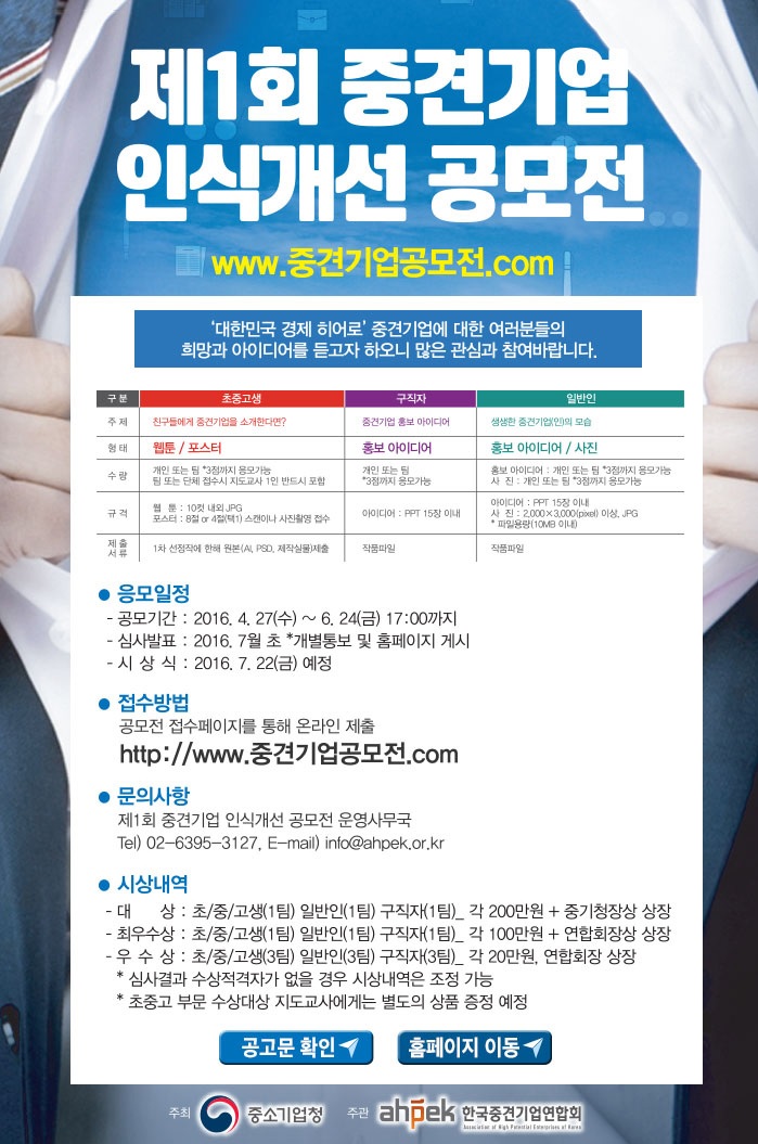 중소기업청이 주최하는 이번 공모전엔 초·중·고생, 구직자, 일반인 등 대한민국 국민이라면 누구나 참여할 수 있으며, 대상별 주제에 따라 웹툰, 포스터, 사진, 홍보아이디어 등 다양한 형태의 창작물을 접수한다.