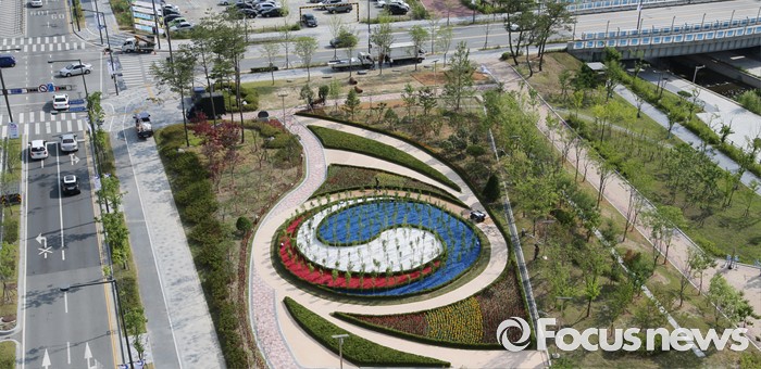 (세종=포커스뉴스) 16일 오후 세종시 정부세종청사 우정사업본부 인근에 '나라꽃동산' 개장식이 열렸다. 니라꽃동산은 정부상징문양인 삼색 태극문양으로 조성됐다.